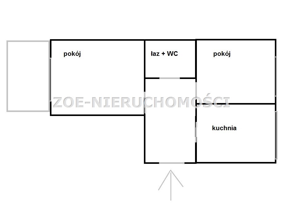 Rozkład: dwa oddzielne pokoje + kuchnia, łazienka z WC i duży przedpokój.