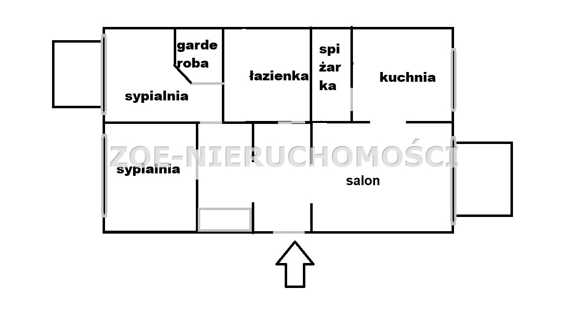 Rozkład: salon otwarty połączony z kuchnią, holl, duża łazienka, 2 sypialnie (w tym sypialnia główna z własną garderobą).